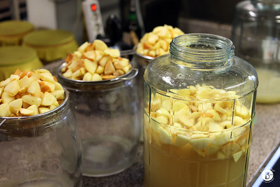 On the picture above, you can see two jars filled with apples, water and sugar during the anaerobic fermentation. The one on the right was recently set, and the one on the left is about two weeks old.